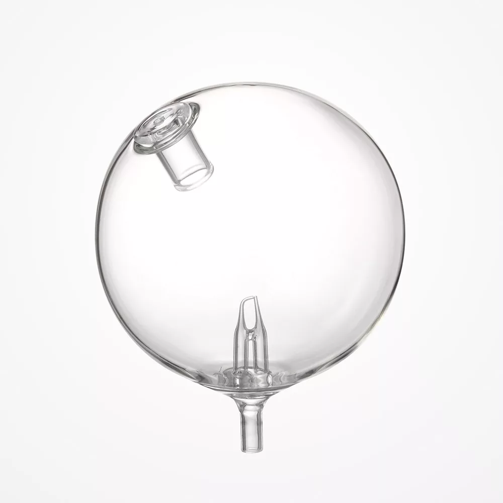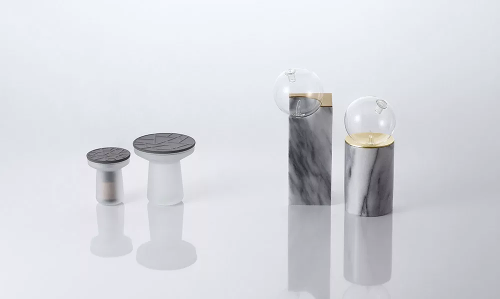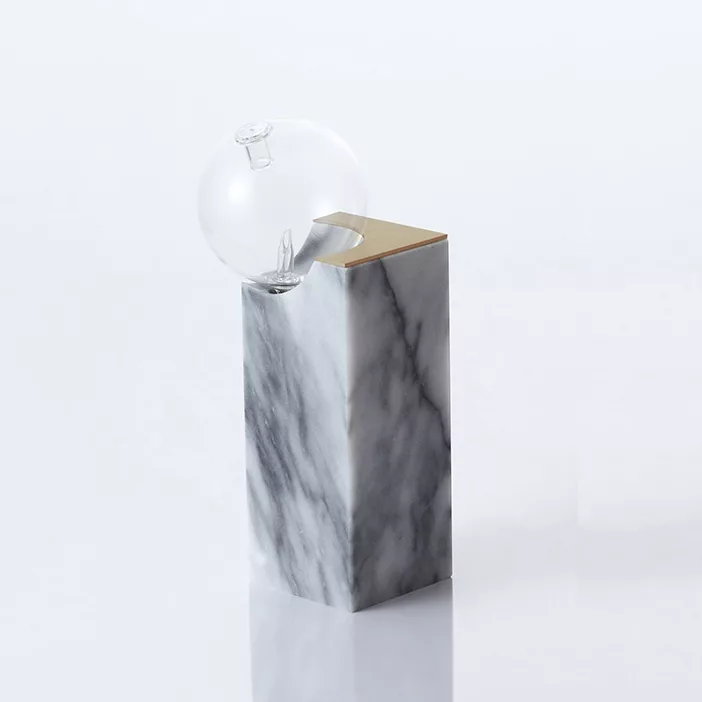 從《石頭記》女媧鍊五色石補天故事說起,以懸垂的儀座,透過玻璃球與大理石柱異材質的結合,書寫天圓地方、圓缺互補的詩意,一如在無境穹蒼的五行世界中靜觀香的靈動,自有物外之趣。
